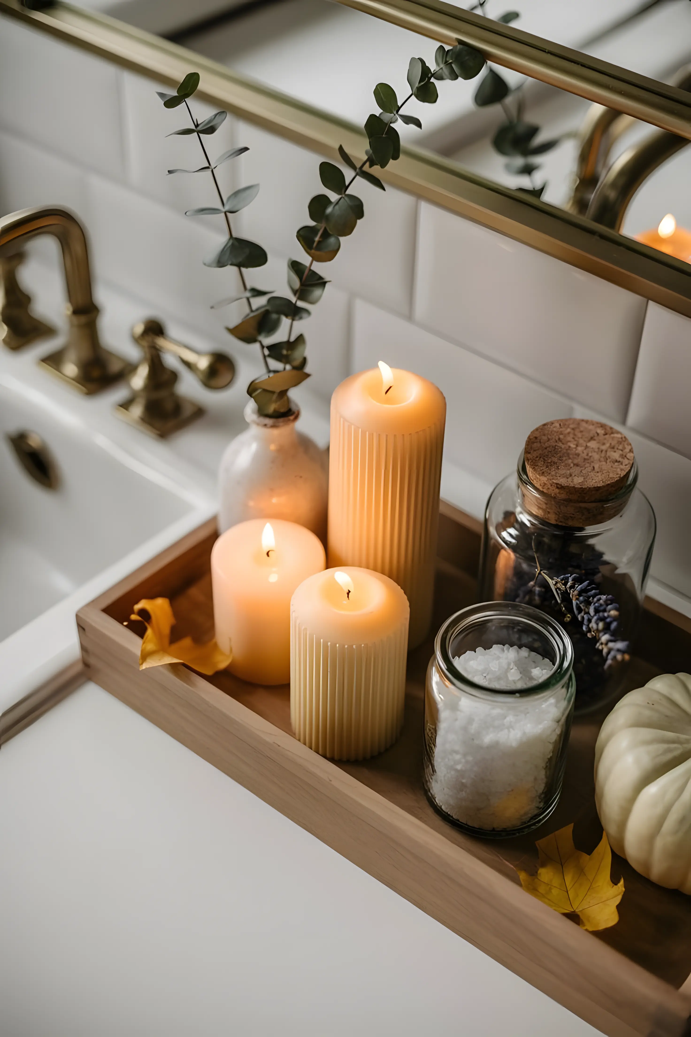 A small candle or a sprig of eucalyptus by the sink.