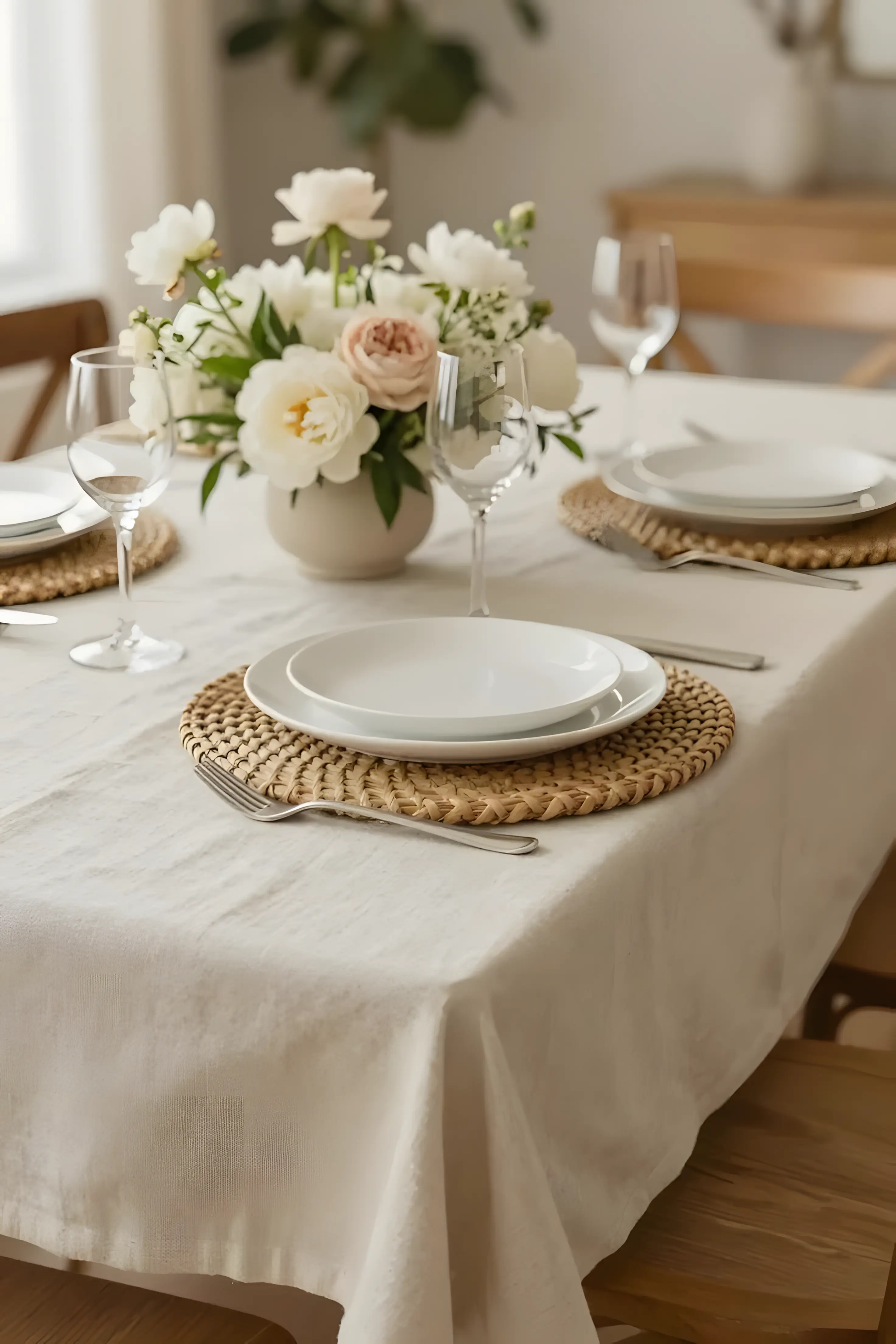Cloth napkins. Real plates. Clear water glasses. Leave space between settings so elbows never collide. Let the table breathe.