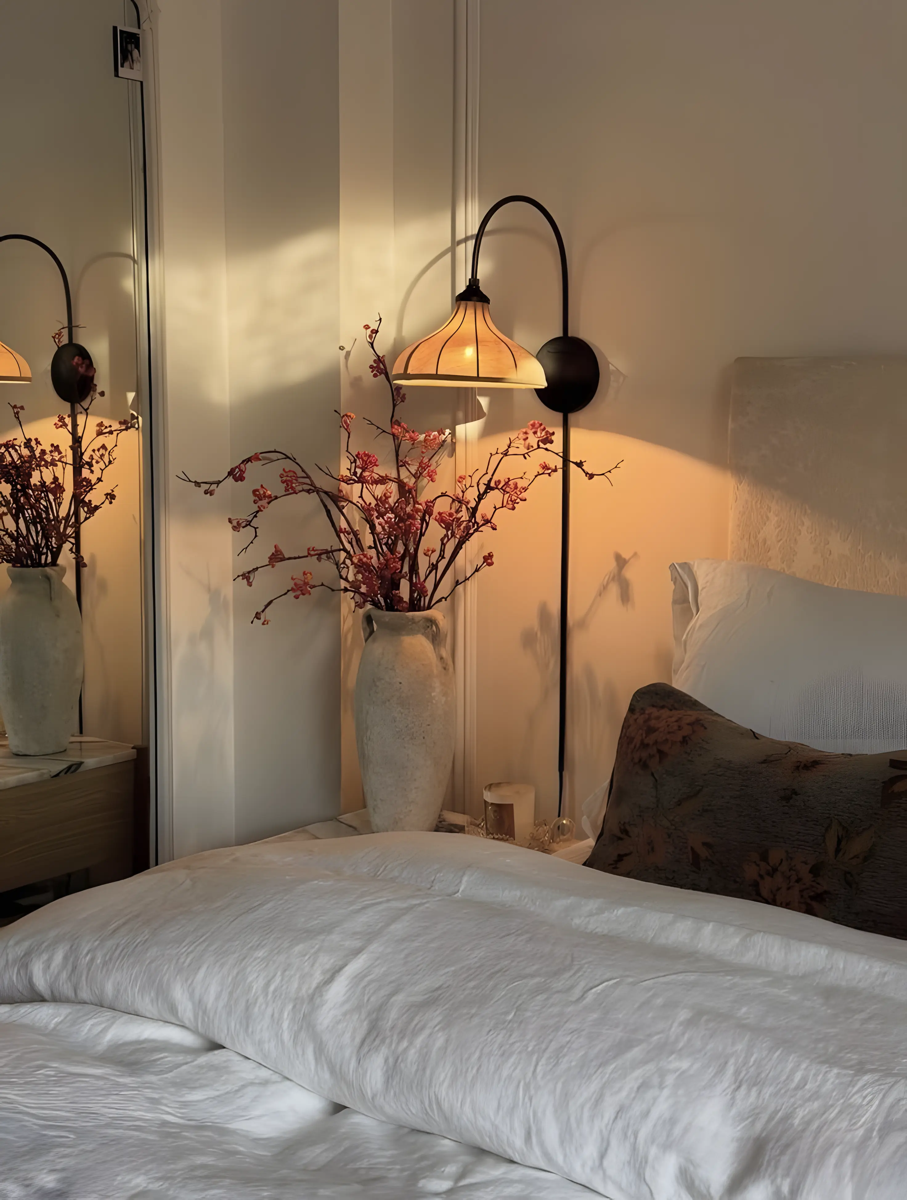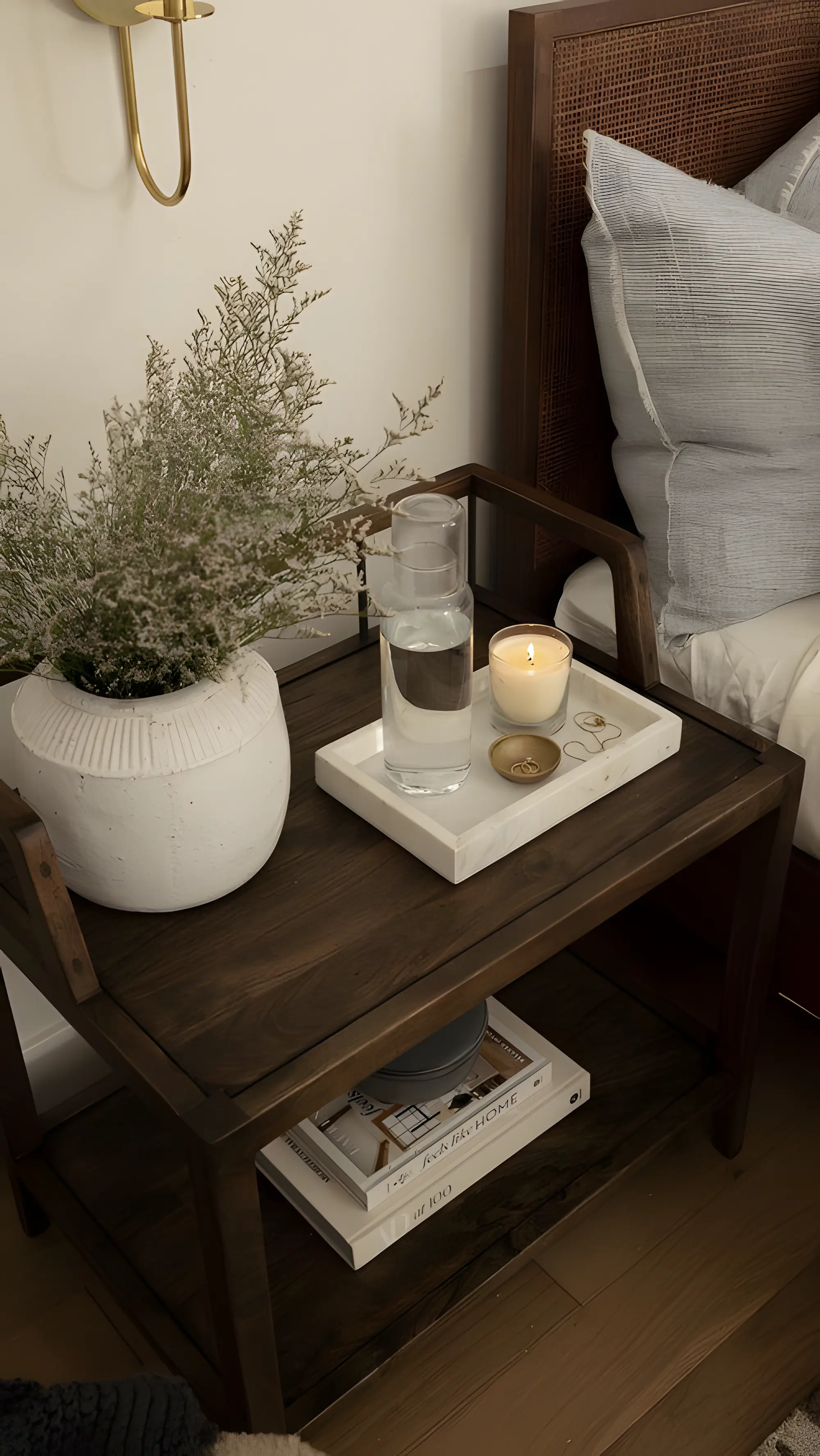 Clear the surfaces, rather than decorate them. A bedside table should always have space: for a book, a phone, a glass of water. One lamp, with warm light.