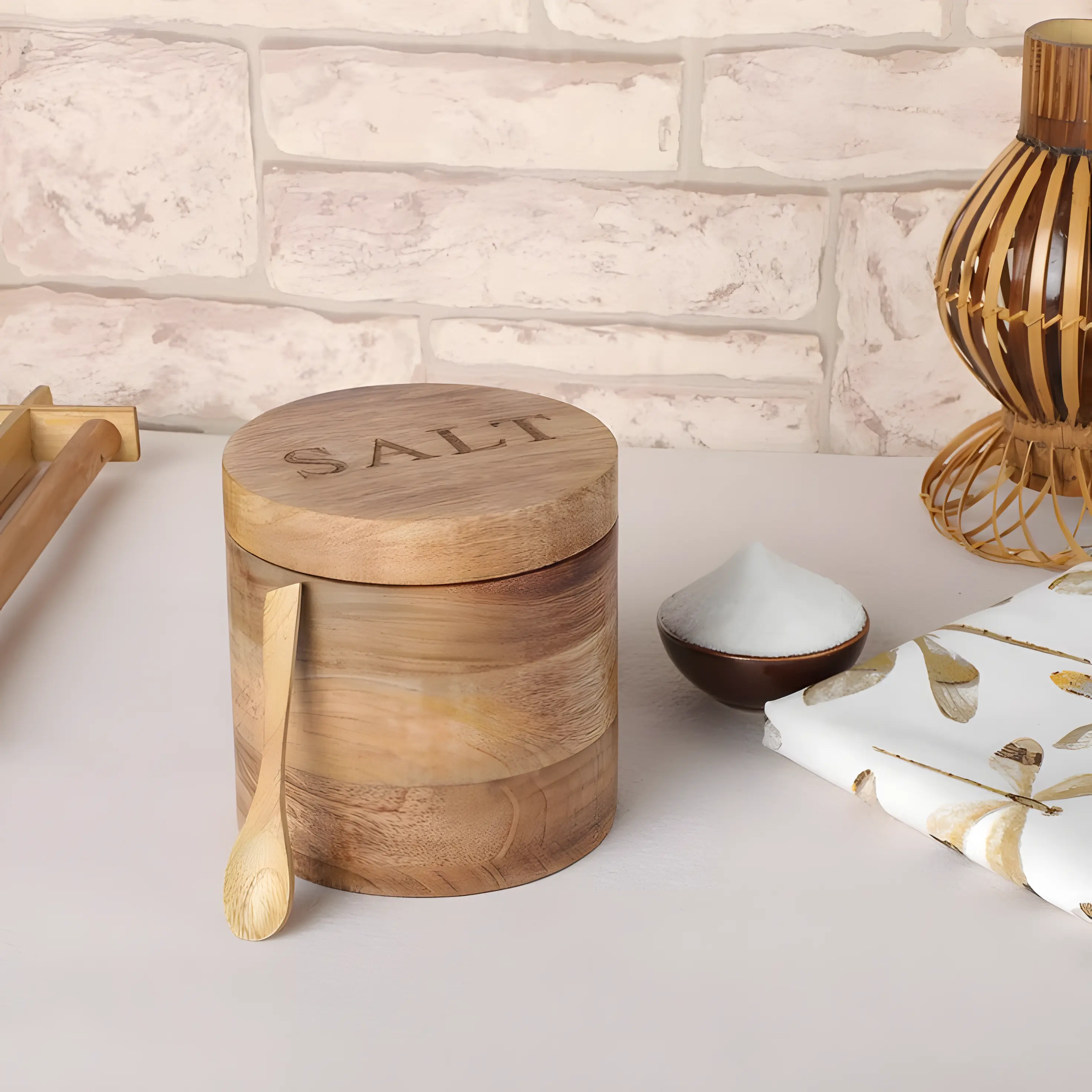 A small wooden salt cellar with a lid that lifts easily.